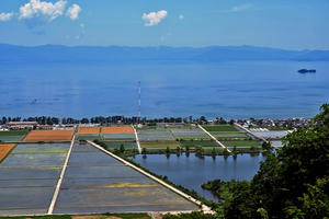 【多景島】見る方向によってさまざまな景色を見せることからその名が付いたといわれる多景島は、彦根市街より沖合約6.5kmに浮かぶ周囲600mの小さな島です。彦根港から遊覧船で行くことができます。島全体が断崖絶壁で、岩の上に松や竹が生い茂り風致に富んでいます。