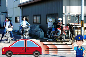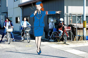 交差点で自転車が一旦停止の案山子 ここに現れたるは娘たち