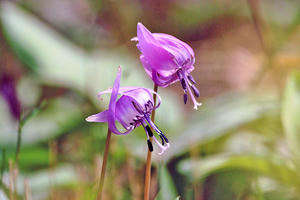 山林の斜面などにうつむいて咲く カタクリの花の姿