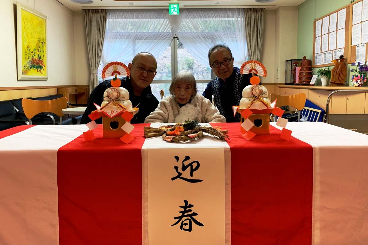 新年の記念写真をロビーで施設長と3人で撮ったね 笑顔が無いね