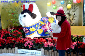 草津市水生植物園みずの森に 先日の新聞で見た情報 干支の犬とポインセチアのコラボレーションが展示