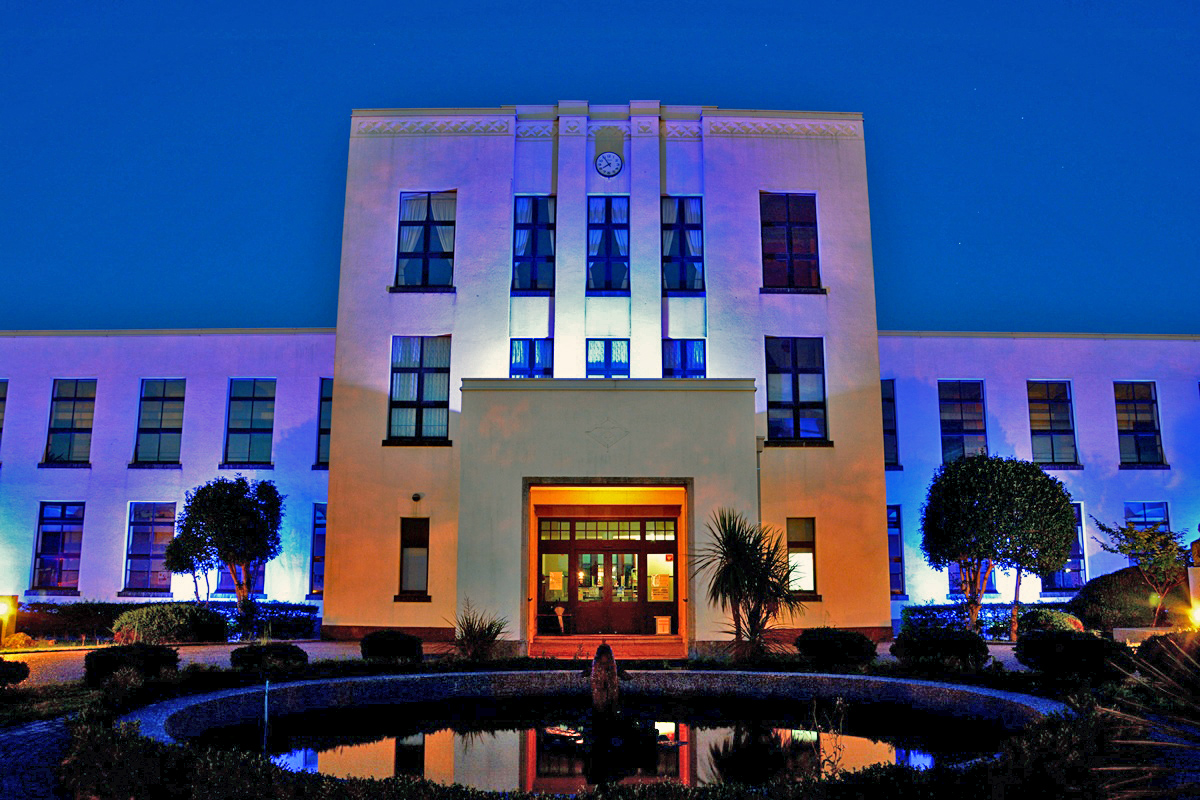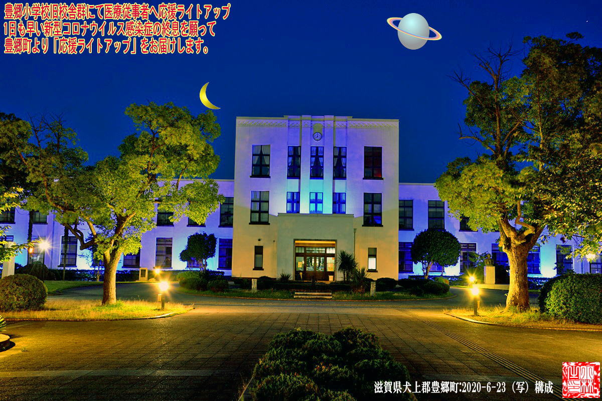 豊郷小学校旧校舎群にて医療従事者へ応援ライトアップ 1日も早い新型コロナウイルス感染症の終息を願って 豊郷町より「応援ライトアップ」をお届けします。
