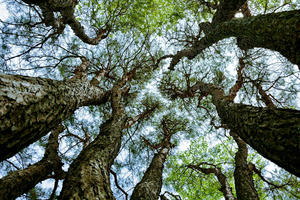 美松山の斜面だけに群生する、極めて珍しいマツ。劣性遺伝による変種といわれ、国の天然記念物に指定されています。根本近くから枝が放射状に分岐した樹形は、まるで扇か傘のよう。平安時代、藤原頼平が静養でこの地を訪れた際、松尾神社の使いの童女が現れ、周囲の山を美しい松に変えたとか。そんな伝説にふさわしい、神秘的なムードをたたえた名所です。
