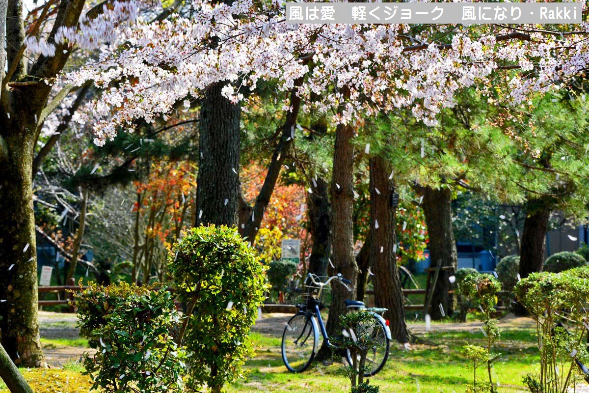 忘れられたような自転車に桜吹雪がカメラうを笑ってる
