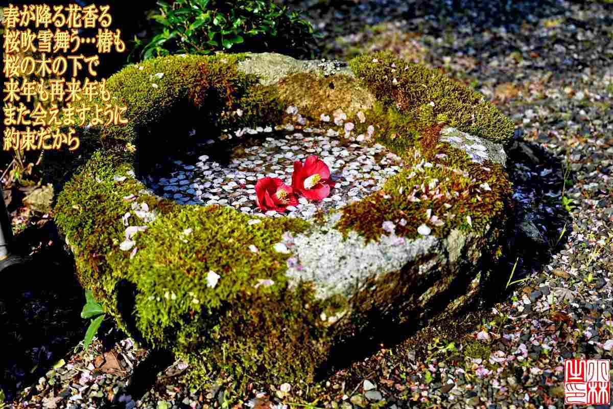 春が降る花香る 桜吹雪舞う…椿も 桜の木の下で 来年も再来年も また会えますように 約束だから 蓮華寺・4/15(写)