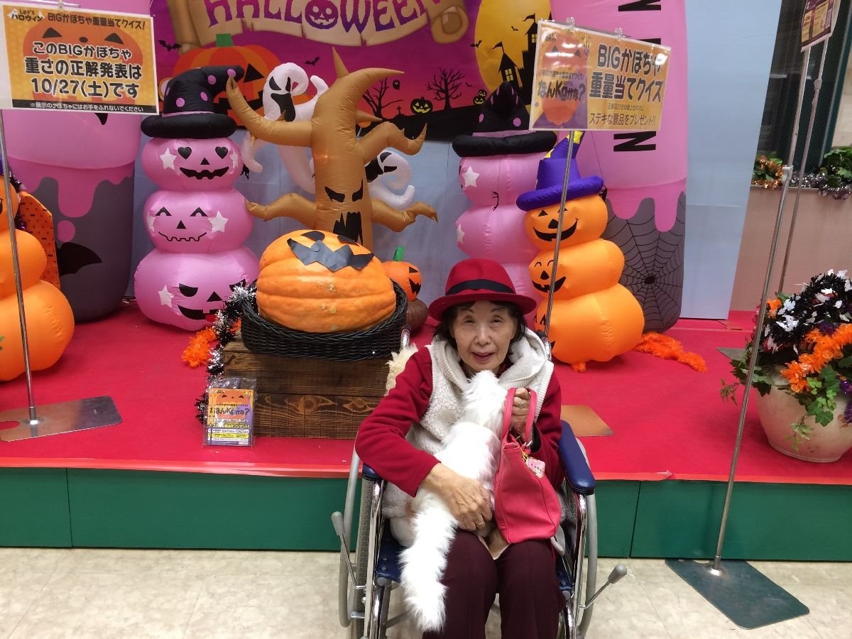 神社の参道で疲れはて動けない老女
