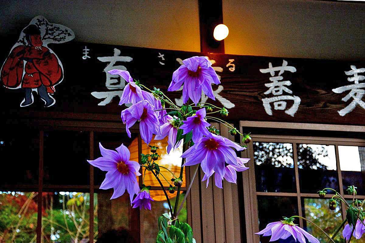 玄関に花を飾り鄙びたソバ屋さん タブン女性の店