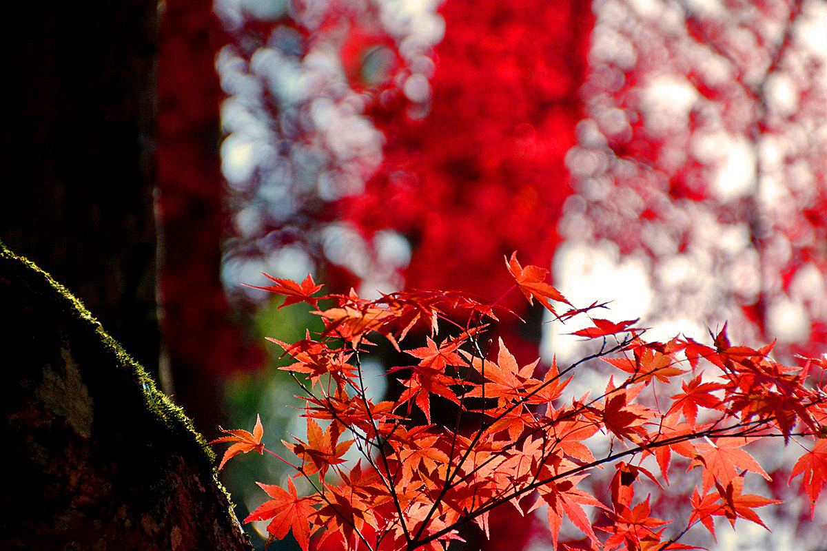バックを大樹の陰 真っ赤な紅葉葉を逆光線に映えて