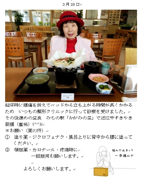 起床時に腰痛を訴えてベッドから立ち上がる時間が長くかかるため いつもの整形クリニックに行って診察を受けました。その後遅めの昼食 みちの駅「かばみの里」で近江牛すきやき御膳(奮発)