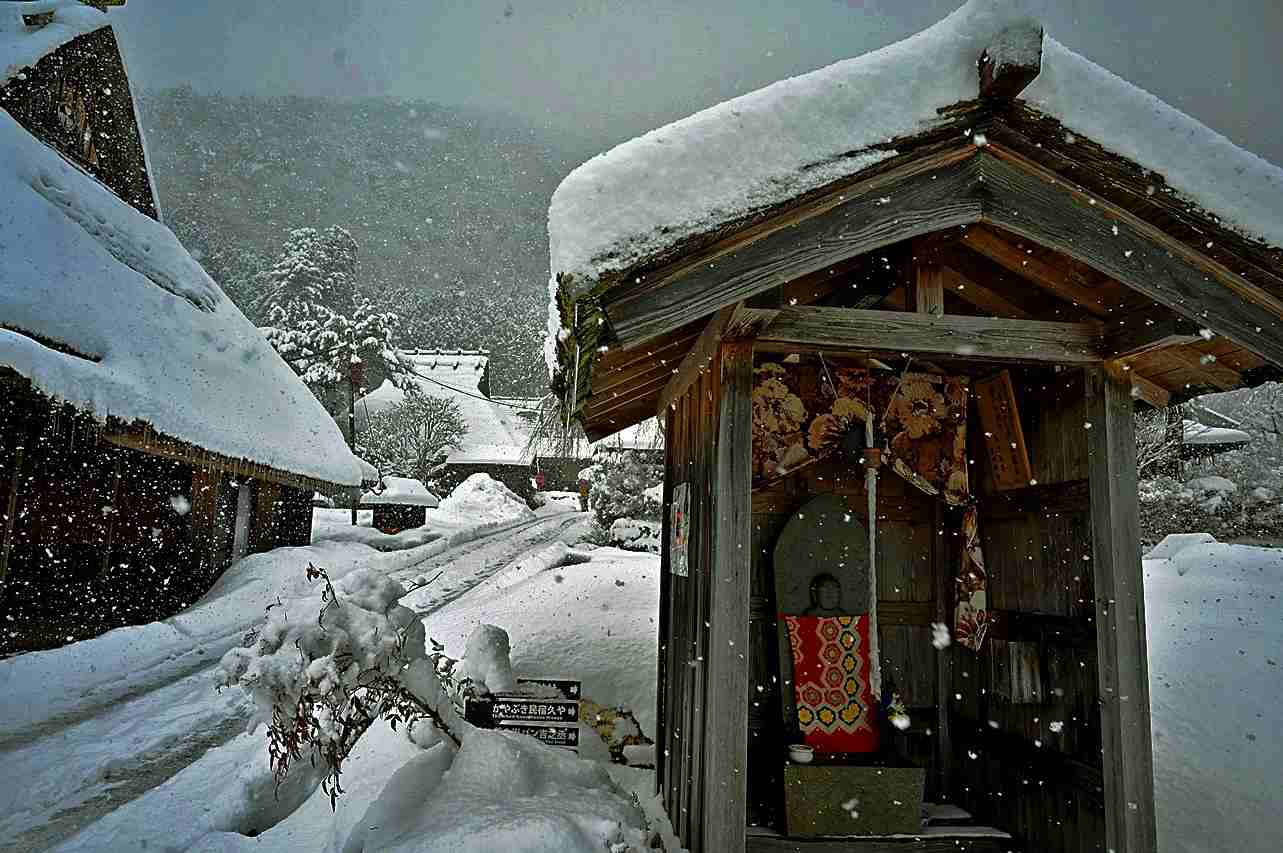 冬は一面の銀世界になるので、赤いポストがより目立ちますね。ここに地蔵さんが鎮座します、雪道の安全を祈願します。